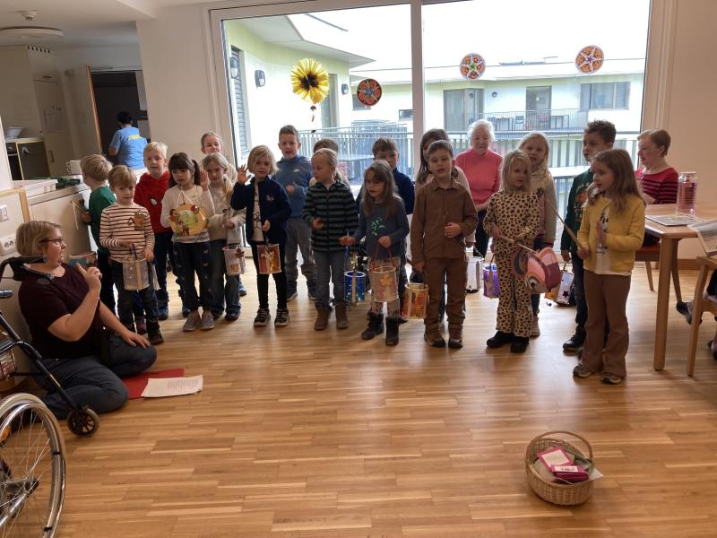 bis ins Altenheim der Barmherzigen Brüder. Das taten die Kinder der 1a und 1b. Sie marschierten mit ihren Laternen durch das Altenheim und bereiteten den Bewohnerinnen und Bewohnern Freude durch das Singen von Martinsliedern und durch ihre Gedichte. Die Kinder hatten im Vorfeld fleißig Martinsbilder gemalt, die sie dann zum Abschied ihrem begeisterten Publikum austeilten.