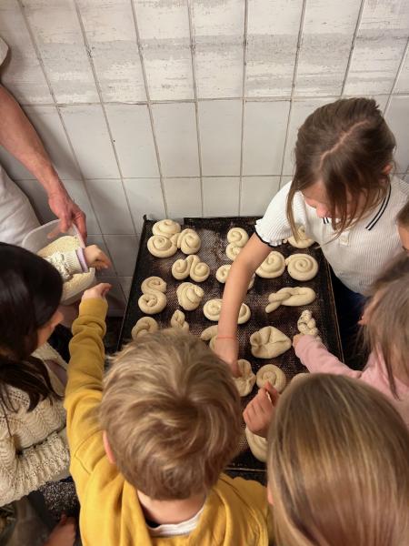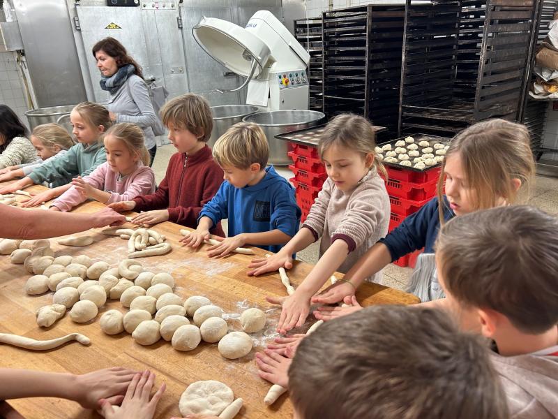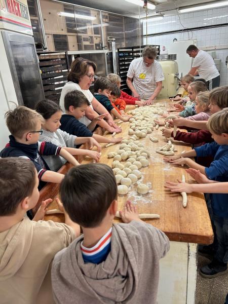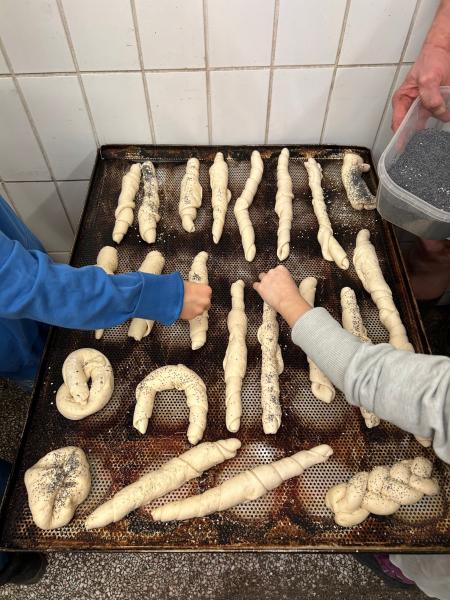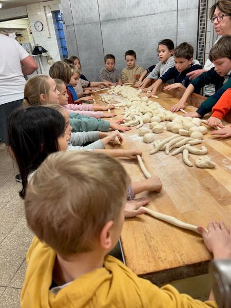 Nach einer interessanten Führung durch die Backstube durften die Kinder Handsemmeln, Mohnflesserl, Kipferl, Handsalzstangerl, Striezel, Brezen und eigene Kreationen selbst formen, bestreuen und backen. Auch erfuhren wir viel Wissenswertes über die Erzeugung von Brot und Gebäck.